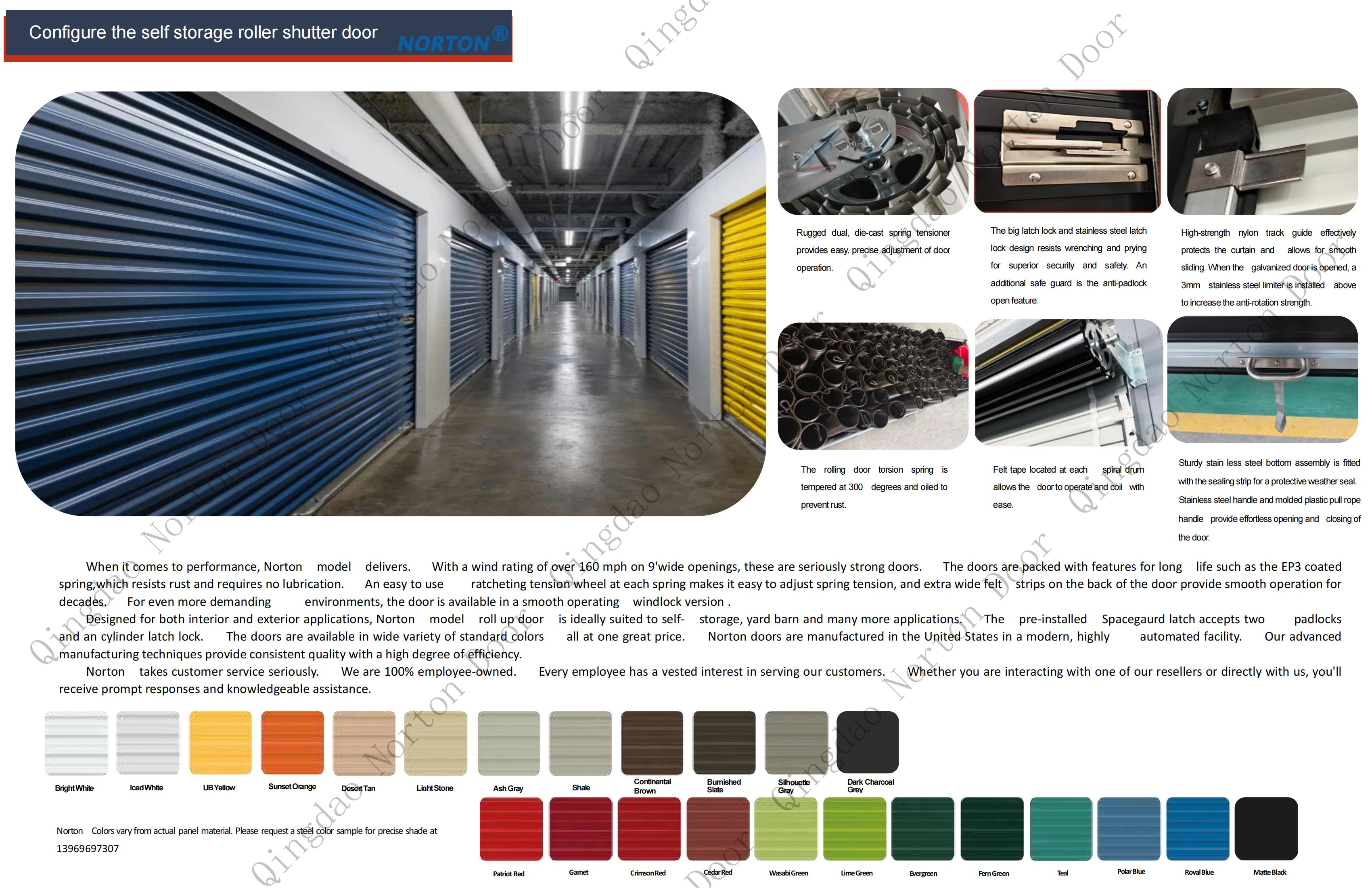 Qingdao Norton Door Technology Co., Ltd. prioriza la satisfacción del cliente, ofreciendo servicios a medida para la unidad de autoalmacenamiento de acero con puerta enrollable. Desde el diseño hasta la instalación y el mantenimiento, mantenemos un riguroso control de calidad para garantizar productos y servicios de primer nivel. Nuestro compromiso con la excelencia y el enfoque del cliente-centrista nos distingue en la industria.